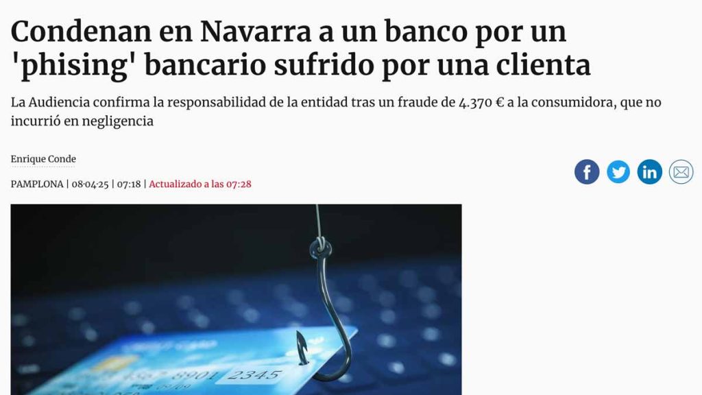 Diario de Noticias se hace eco de la sentencia de la Audiencia Provincial de Navarra que condena a CaixaBank a devolver 4.370 € a una clienta afectada por operaciones fraudulentas tras un caso de phishing bancario. La afectada recibió un correo electrónico que imitaba a la entidad y, creyendo que era legítimo, accedió a un enlace donde introdujo sus claves de acceso. A partir de ahí, los ciberdelincuentes realizaron dos operaciones sin su consentimiento: un traspaso a una cuenta externa y la contratación de una tarjeta prepago.