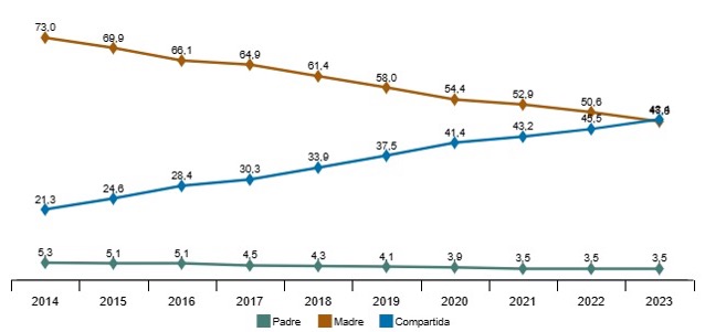 La cuestión de quién se queda con la custodia también ha experimentado un notable cambio en los últimos años. En 2014, en 3 de cada 4 casos, era la madre quien asumía la custodia, mientras que solo en 1 de cada 4 casos se optaba por la custodia compartida. Sin embargo, en la actualidad, estas dos modalidades están casi igualadas entre ambas opciones. El caso de la custodia para el padre, apenas a sufrido variación, siendo una opción casi inexistente.