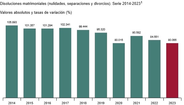 Las nulidades, separaciones y divorcios hace tiempo que son una realidad en nuestra sociedad y suponen un gran cambio tanto para la estructura familiar como para su economía. En la ultima década, hemos visto una tendencia a la baja en el número de divorcios que se producen, habiendo descendido de los más de 100.000 que se produjeron en 2014 a los 80.00 que se produjeron en 2023, fecha del ultimo dato que tenemos disponible.